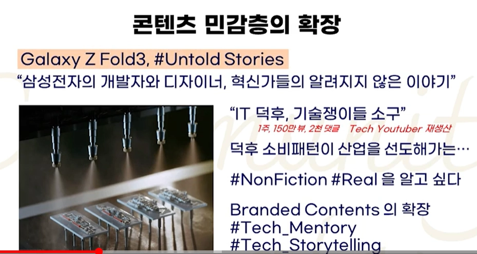 삼성전자의 언팩행사. 신제품 알리는 캠페인. 온라인 컨텐츠로 만들었는데 기술 파트를 소개. 프로페셔널한 기술 컨텐츠. IT 덕후나 기술쟁이들에게 소개하겠다고 생각했지만, 컨텐츠 업로드되고 나서 150만뷰, 댓글 수천개가 달리면서 바이럴이 확장. 테크 유튜브들이 이 클립들을 재상산...