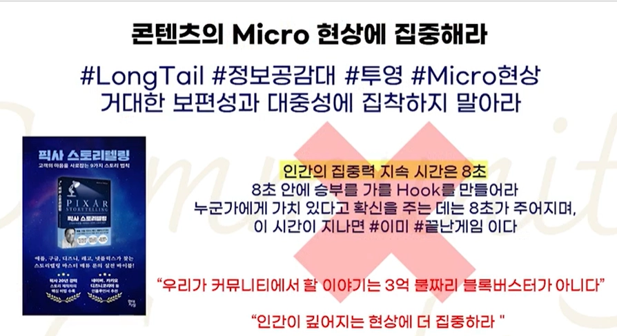 커뮤니티 크리에이터 컨텐츠의 속성과 상반되는 이야기를 이 책에서 하고 있다.
