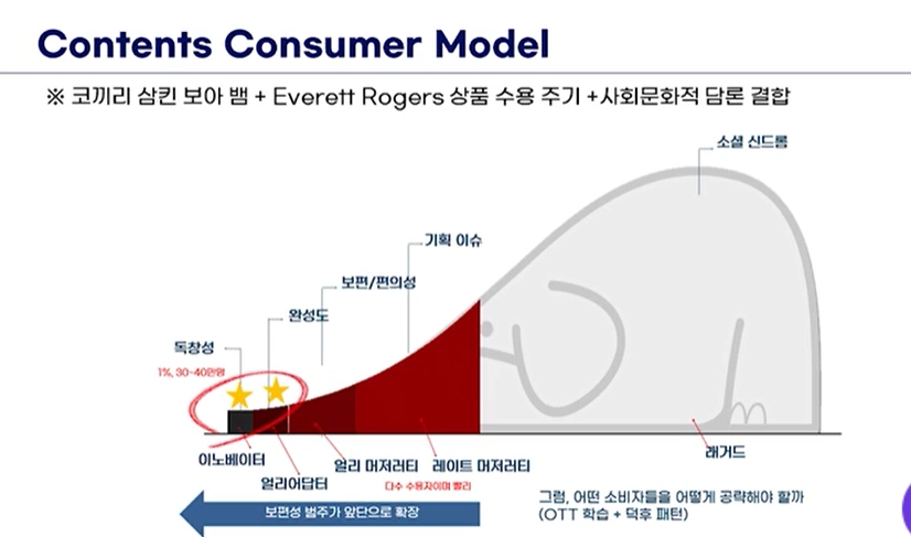 과거에는 기업들이 머저러티 집단만 공략. 이제는 개인 취향 시장에 열려서 보편성과 관계 없는 트렌드 열림. 덕후 패턴들이 산업을 선도하는 트렌드로 끌어감. 기업, 창작자들이 이노베이터, 얼리어답터들에게 집중하기 시작한 기업들. 컨텐츠 보편성 범주 자체가 코끼리 앞단쪽으로 확장되어 간다. 컨텐츠 민감성 확장되어 감.