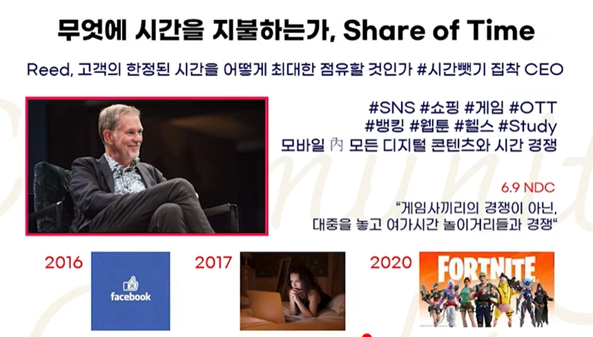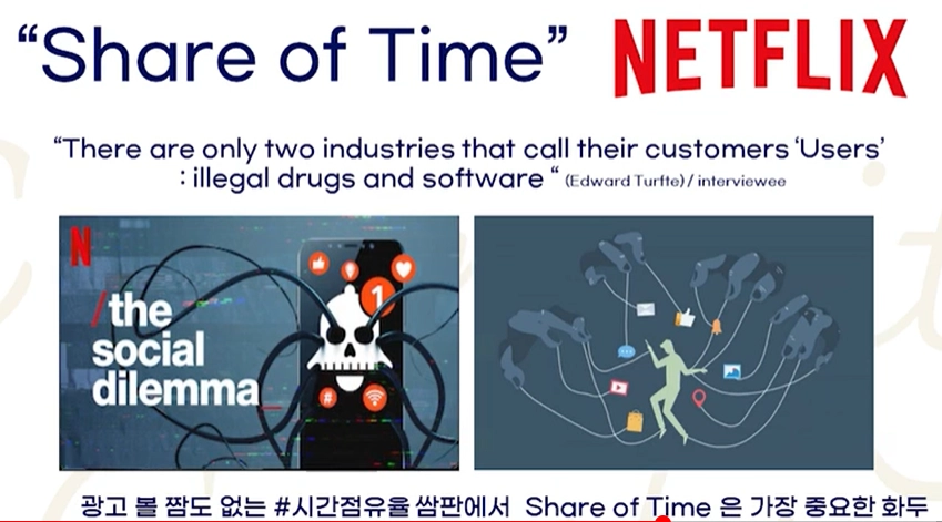 십수년 전부터 시간뺏기에 집착. 2016년은 페북의 전성시대. 그 때부터 리드가 고민하기 시작함. “넷플릭스의 경쟁자는 페이스북이다”